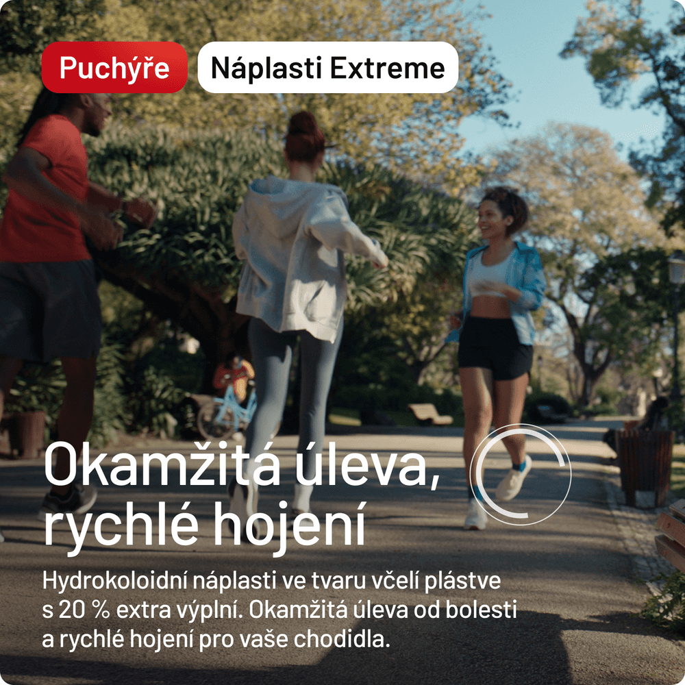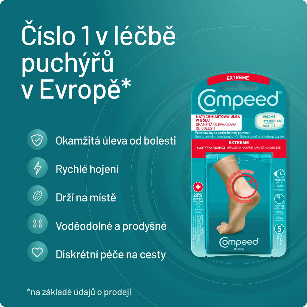Compeed® náplasti na puchýře Extreme s hydrokoloidní technologií pro okamžitou úlevu od bolesti a rychlé hojení. Struktura medové plástve poskytuje o 20 % více tlumení pro optimální pohodlí a ochranu během jakékoli vysoce intenzivní aktivity.* Vhodné pro velmi bolestivé puchýře, například ty, které vznikají při sportování.
