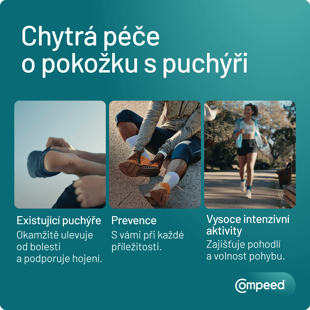 Pokud nosíte boty, které vám často způsobují puchýře, chraňte nohy před třením pomocí Compeed náplastí na puchýře. Další variantou je si při cvičení nebo delší chůzi vzít dva páry tenkých ponožek. Podrobné rady na prevenci puchýřů najdete v našem kompletním průvodci.