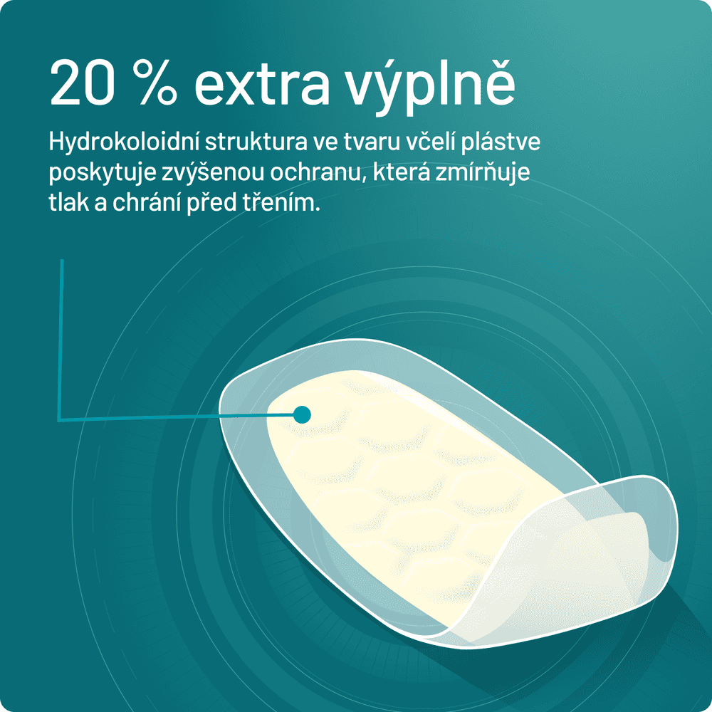 Compeed® hydrokoloidní náplast obsahuje částice absorbující tekutinu (exsudát) a přeměňují ji na gel, čímž vytvářejí vlhké prostředí podporující hojení.
