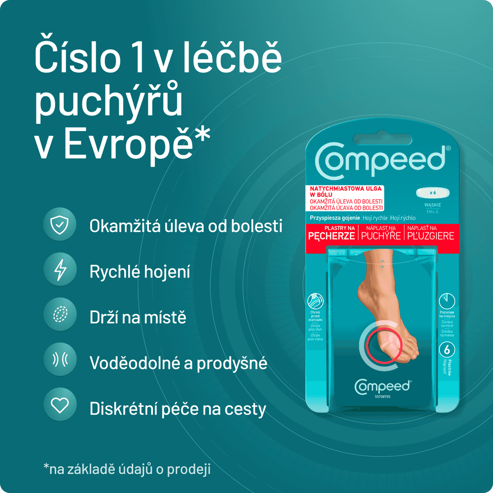 Compeed® Náplast na puchýře malá absorbuje přebytečnou tekutinu a vytváří ochranný polštářek, který poskytuje okamžitou úlevu od bolesti a optimální podmínky pro hojení puchýřů na nohou.