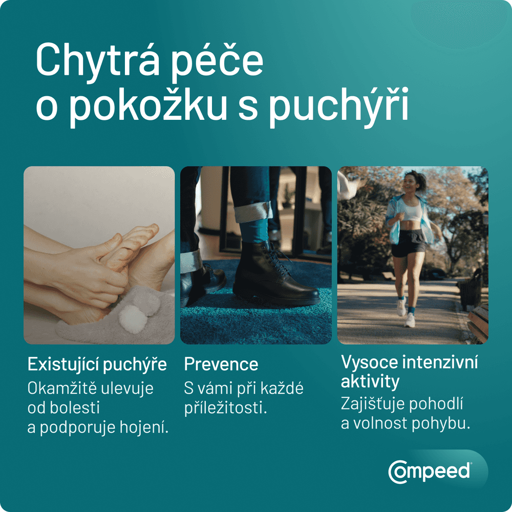 Pokud nosíte boty, které vám často způsobují puchýře, chraňte nohy před třením pomocí Compeed náplastí na puchýře. Další variantou je si při cvičení nebo delší chůzi vzít dva páry tenkých ponožek. Podrobné rady na prevenci puchýřů najdete v našem kompletním průvodci.