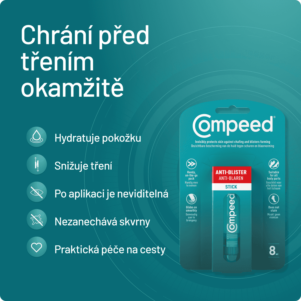 Pokud nosíte boty, které vám často způsobují puchýře, chraňte nohy před třením pomocí Compeed náplastí na puchýře. Další variantou je si při cvičení nebo delší chůzi vzít dva páry tenkých ponožek. Podrobné rady na prevenci puchýřů najdete v našem kompletním průvodci.
