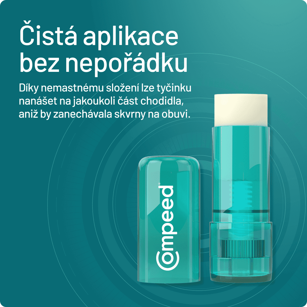 Diskrétně pomáhá předcházet puchýřům a odřeninám. Compeed® Tyčinka proti puchýřům účinně zabraňuje tření a vzniku puchýřů. 90 % dotázaných uživatelů uvedlo, že jim pomohla předejít puchýřům a odřeninám na nohou.* *Test používání produktu mezi 200 spotřebiteli (Francie, 2003 a Austrálie, 2004).