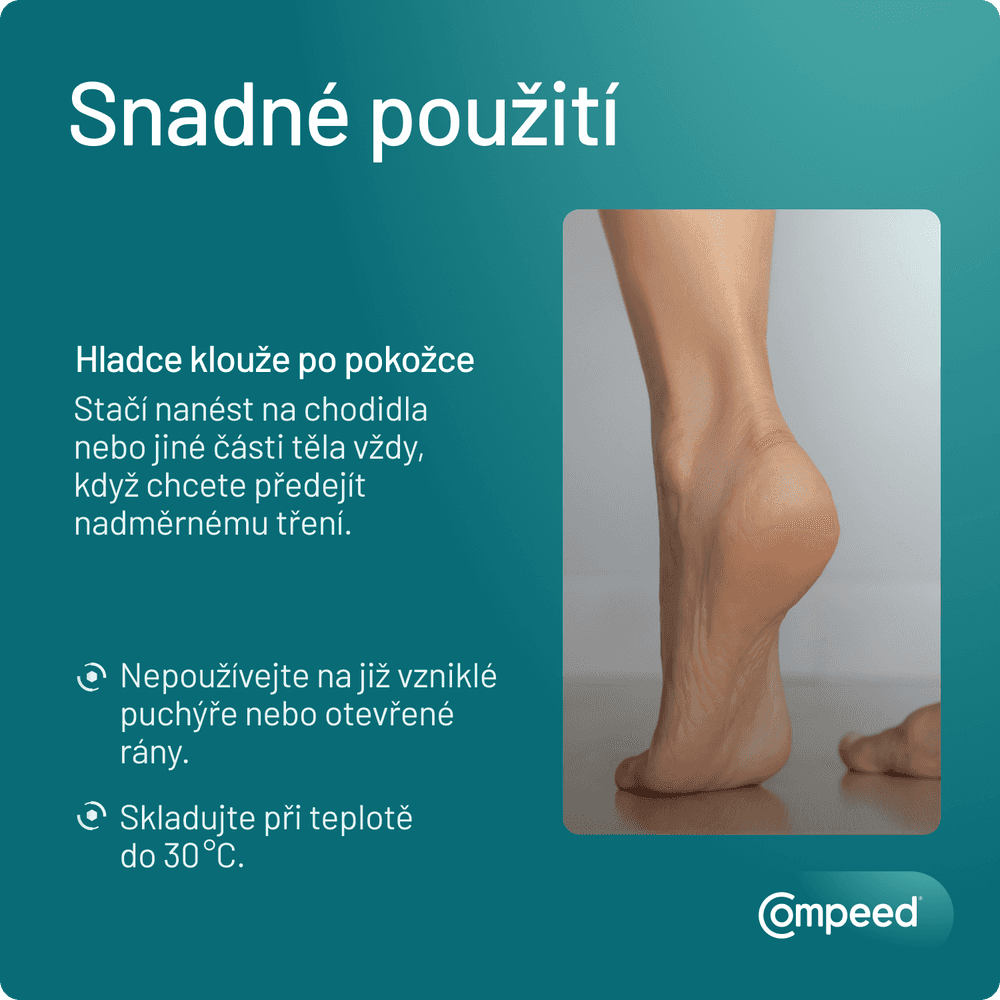 Naneste na chodidla nebo jiné části těla, kdykoli chcete zabránit nadměrnému tření pokožky.