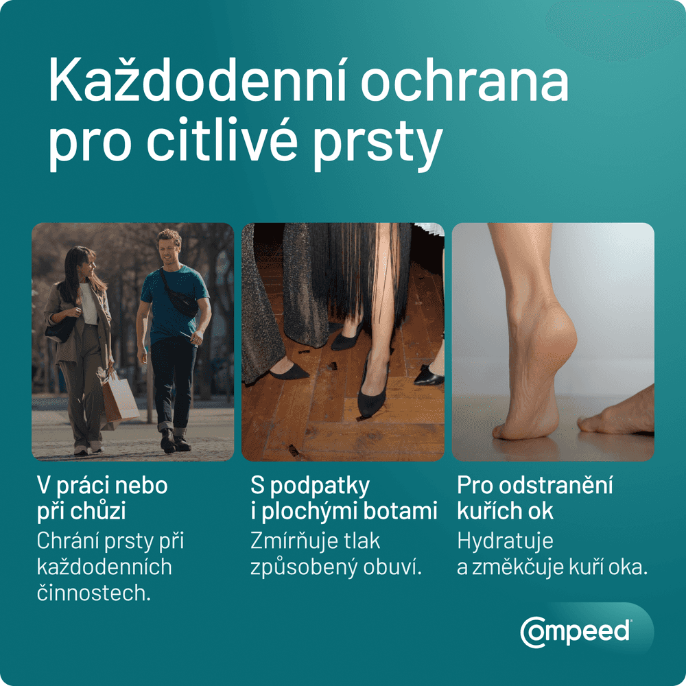 Abyste předešli vzniku kuřích ok, začněte snižováním tlaku na chodidla a pravidelně je hydratujte – zejména pokud plánujete nosit těsné boty. Použití hydrokoloidní náplasti, například Compeed® na kuří oka, může také pomoci zmírnit tlak a zároveň udržet přirozenou vlhkost pokožky.