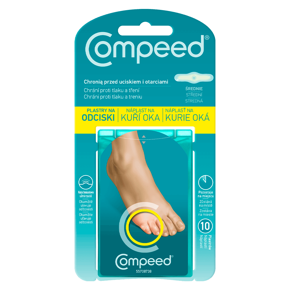 Compeed® náplasti na kuří oka obsahují hydrokoloidní technologii, která poskytuje okamžitou úlevu od bolesti a napomáhá odstranění kuřího oka. Nejenže náplast drží na místě i několik dní*, ale zároveň chrání pokožku před třením a tlakem. *Jednotlivé zkušenosti se mohou lišit.