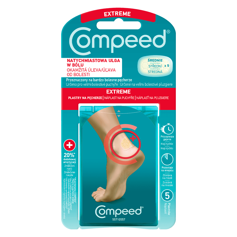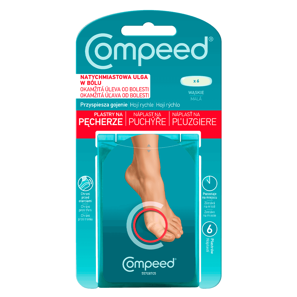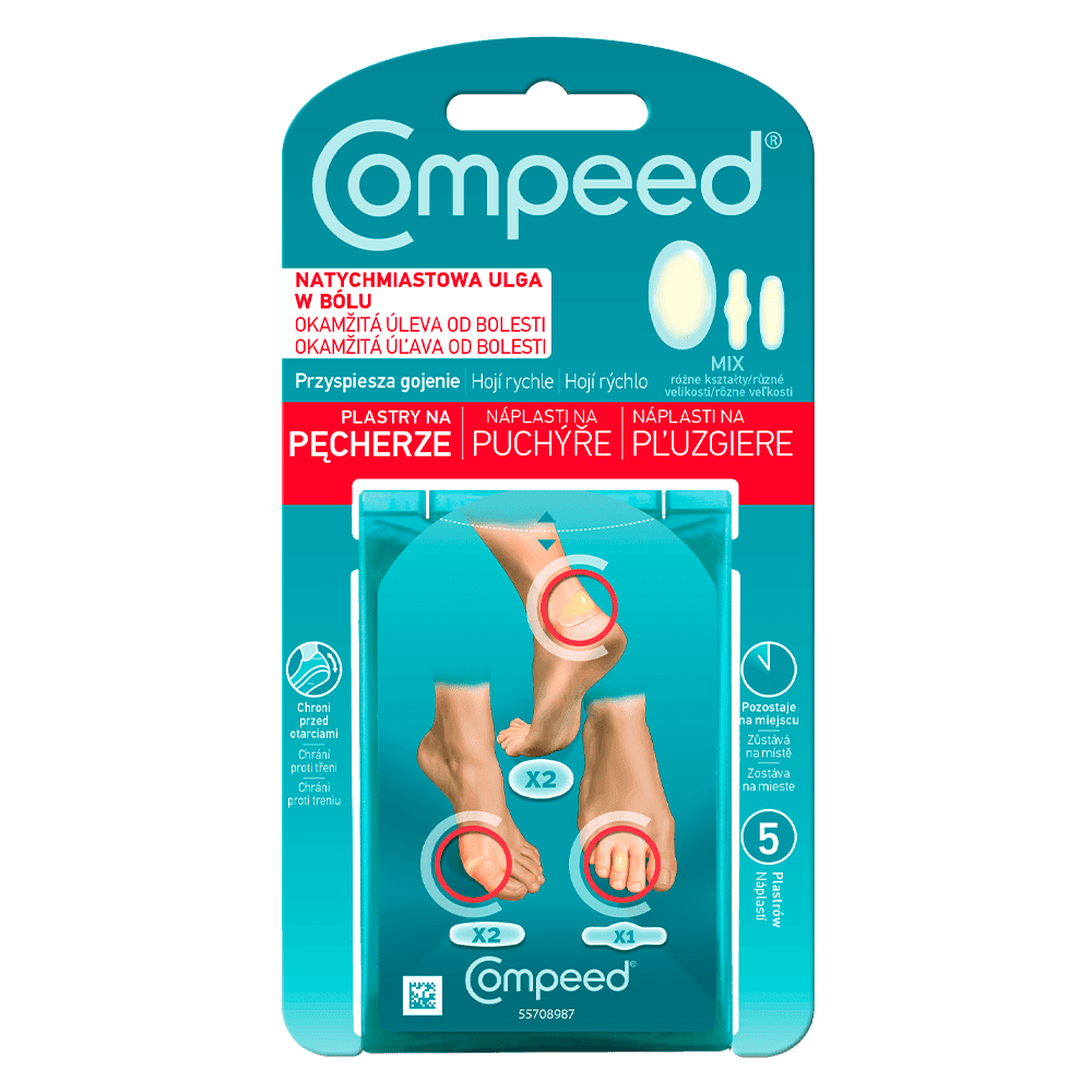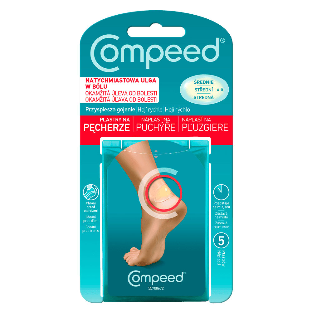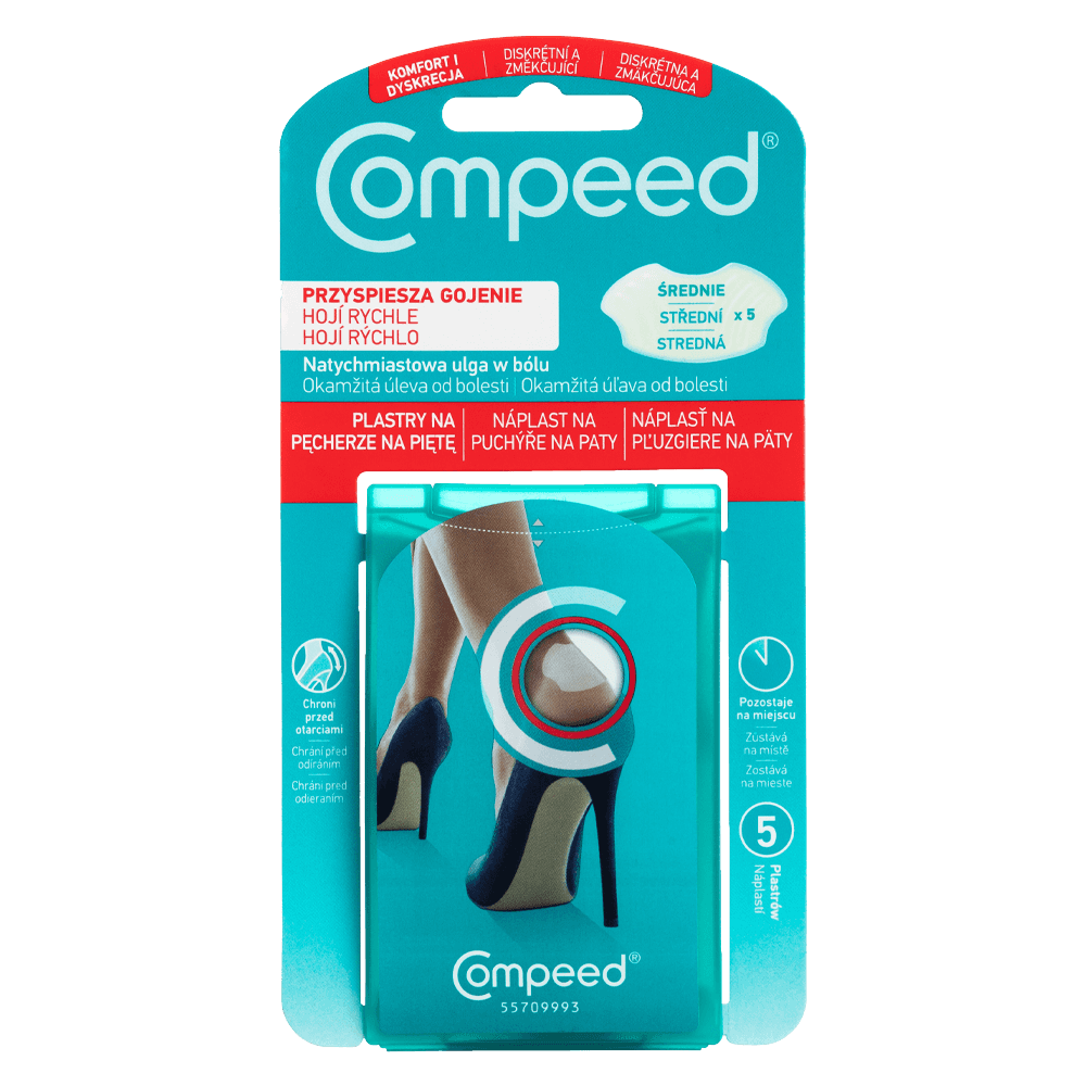 Compeed náplasti na puchýře díky ochrannému polštářku okamžitě ulevují od bolesti a hydrokoloidní technologie zajišťuje optimální podmínky pro hojení puchýřů na nohou. Lepivý materiál a zúžené okraje umožňují, aby se náplast přizpůsobila pohybu a zůstala na místě i několik dní (individuální zkušenosti se mohou lišit).